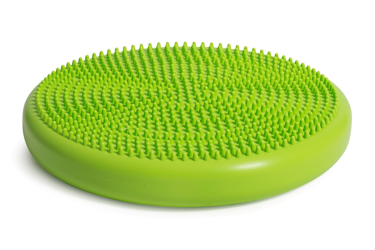Versatile inflatable cushion can be used sitting, standing or lying on the floor. It can be used sitting to regulate accumulated energy, improve concentration and promote good sitting posture. Standing use improves proprioceptive and balance skills.