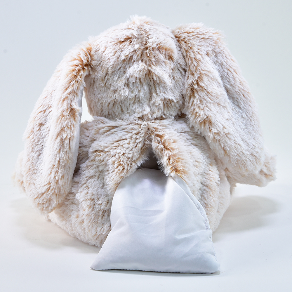 Open de achterkant van het pluche konijn en verwijder het warmtekussen. Plaats het warmtekussen ongeveer 30 seconden in de magnetron en stop het terug in de knuffel. De warmteknuffel weegt ongeveer 300g en bevat lijnzaad en lavendelgeur.