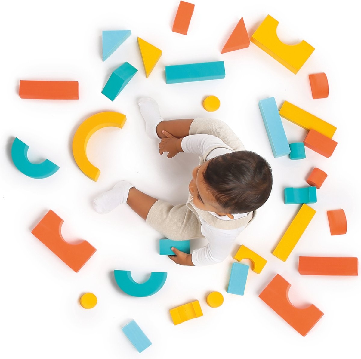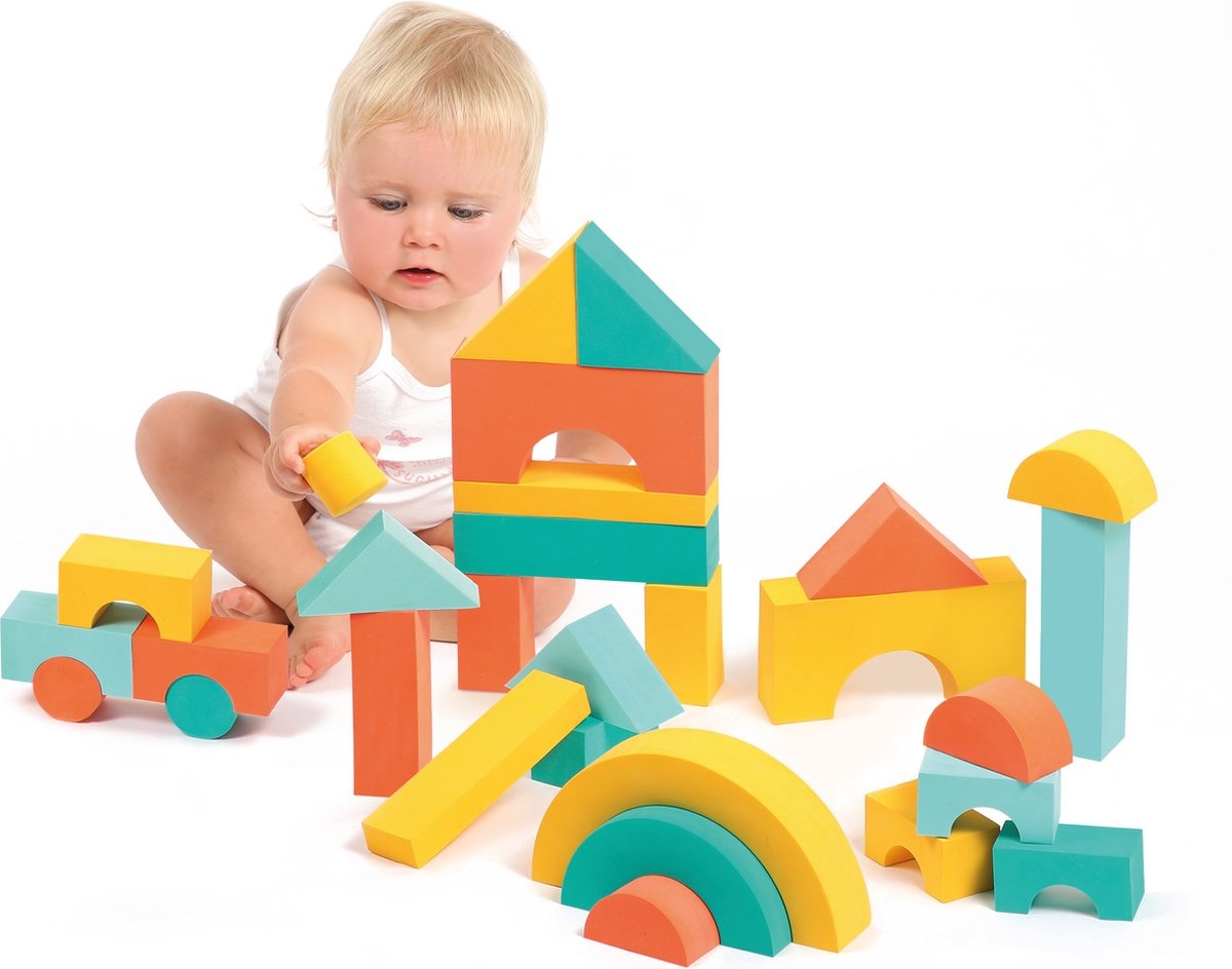 Zachte, lichte foam blokken om veilig te bouwen, stapelen en ontdekken. Ideaal voor kleine handjes en kinderen die gevoelig zijn voor geluid.. Lees meer